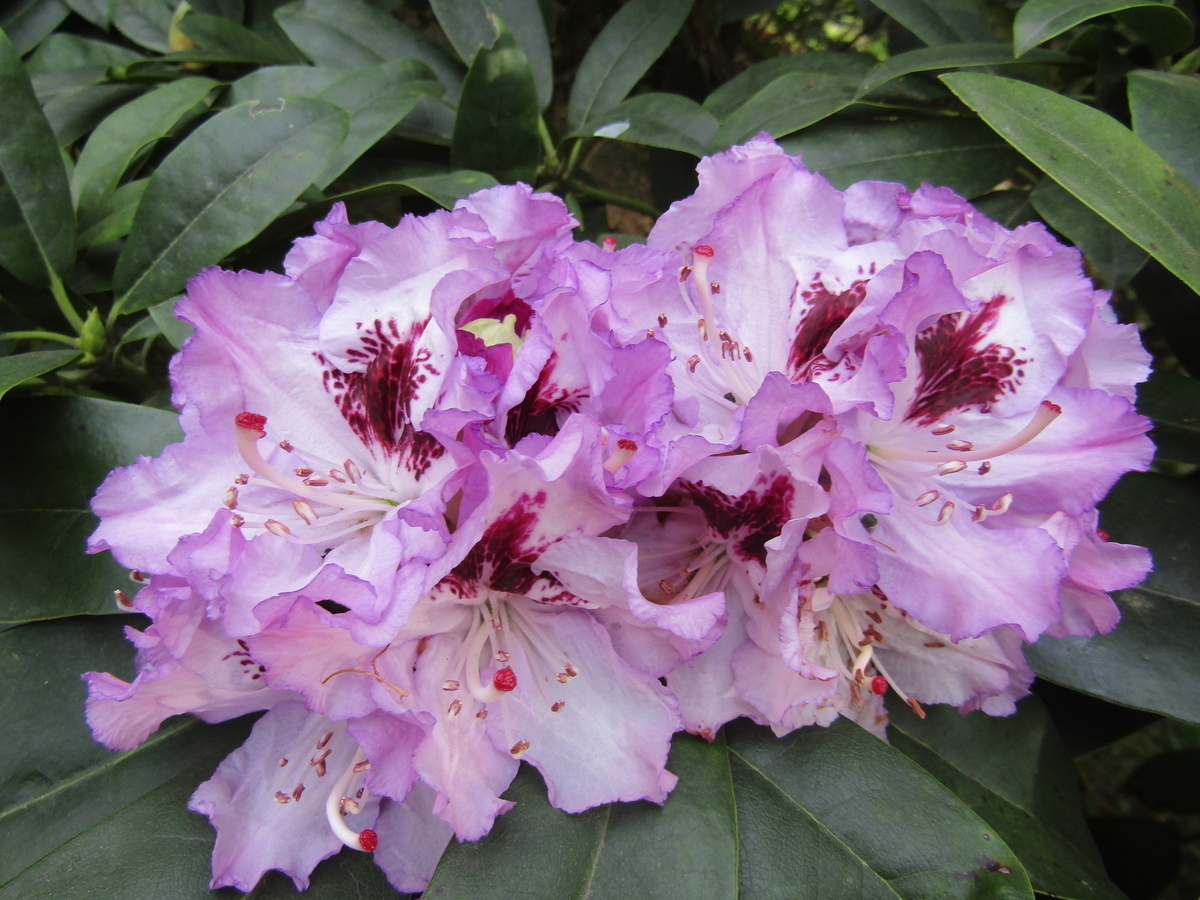 Being a flower park, there were other flowers blooming--calla lilies, baby blue eyes, multi-petal cherry blossoms (still hanging in there), petunias, delphiniums, poppies, dove tree flowers, azaleas, rhododendrons, Japanese bigleaf magnolia, dogwood, Japanese snowballs, clematis. There were even resident koi, ducks, and a grey heron at the ponds. Some rhododendrons looked like orchids and hibiscus. Petunias placed like checkerboards were cute, too.